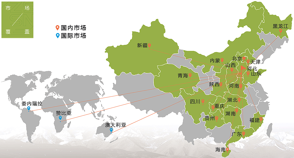 業(yè)務輻射——國內(nèi)的華北五省區(qū)市、西北新疆、青海及河南、山西、山東、福建、廣東、海南等地,海外業(yè)務延伸至澳大利亞、贊比亞、委內(nèi)瑞拉等國家,